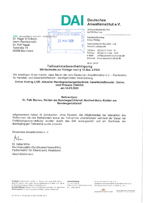 - Aktueller Rechtsprechungsüberblick: Gesellschaftsrecht (Online Vortrag / Mai 2020)